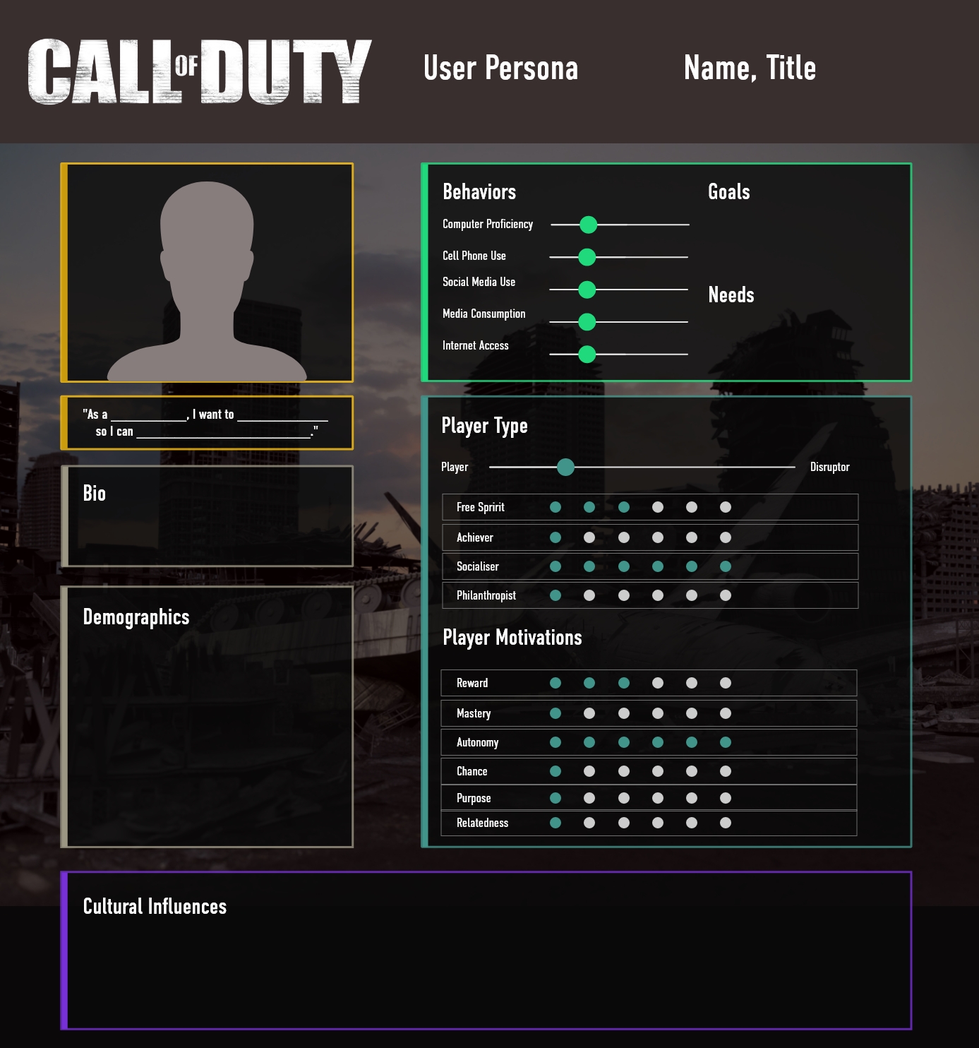 Cultural Analysis: Incorporating a cultural analysis to a user persona report can provide a deeper understanding of the player base. User personas can be more effective when they are based on thorough research and analysis of the users, including the identification of their player types. For example, each of the top five countries that play Call of Duty: Modern Warfare have cultural differences that may influence their player experiences.